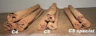 Cinnamon Sticks are separated into seven GradesA well-made cinnamon quill, or "pipe," is a slim cane of uniform thickness, colour and quality, with edges neatly joined in a straight line end to end and looking like a tight roll of golden-brown multi-ply paper.The Cinnamon Sticks are classified into seven grades according to diameter and the number of 42-inch quills to a pound. The Quills range in thickness from the size of a pencil to the handle of a base ball bat. |